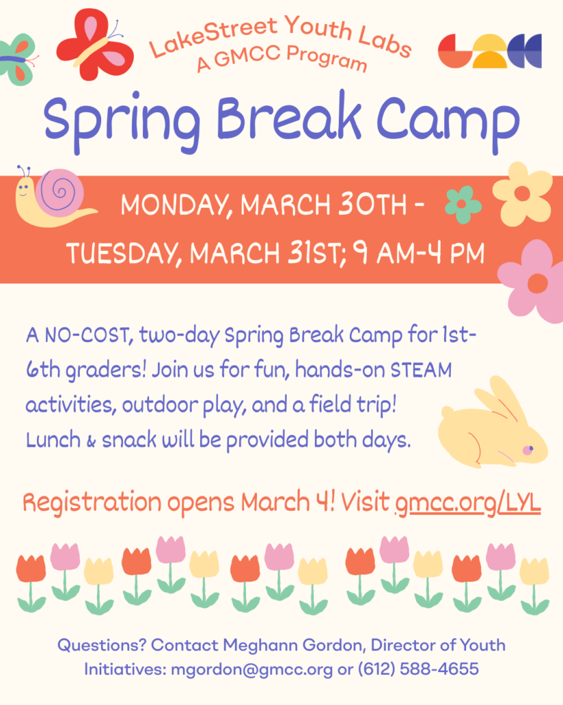 LakeStreet Youth Labs’ annual Spring Break Camp is happening Monday, March 30th – Tuesday, March 31st. This is a NO-COST, full day camp for 1st-6th graders. We will be doing hands-on STEAM activities, outdoor play, and going on a field trip! Lunch & snack will be provided both days. Please contact Meghann Gordon, Director of Youth Initiatives, with questions or concerns at mgordon@gmcc.org or (612) 588-4655. (Spanish & Somali staff available). Registration is OPEN at gmcc.org/LYL